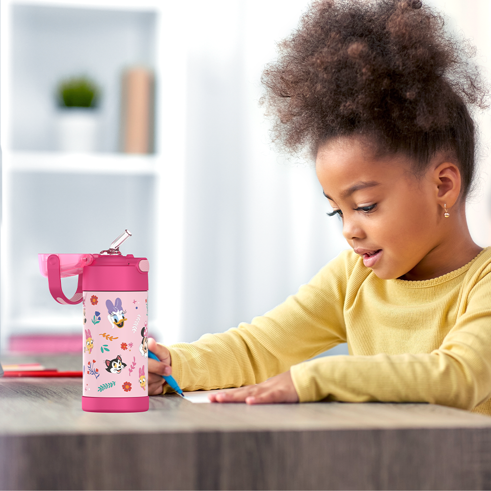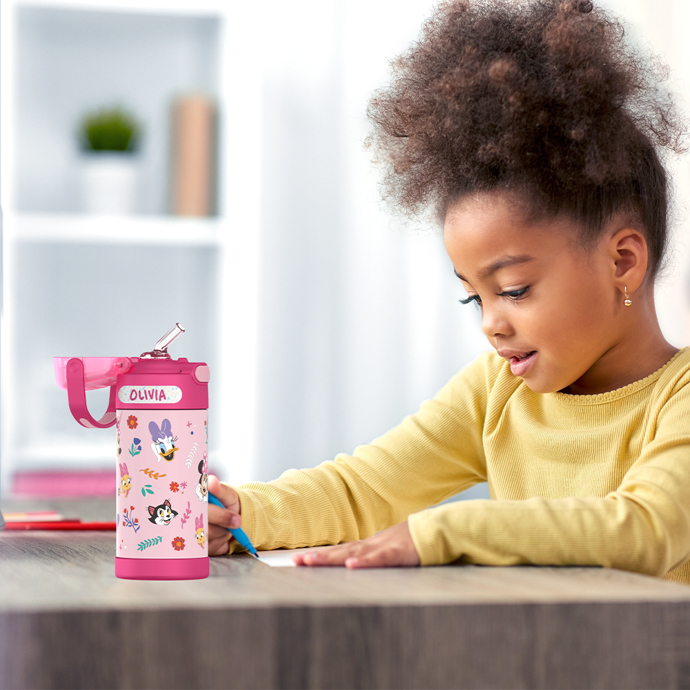 The FUNtainer? 12oz Vacuum Insulated Stainless Steel Water Bottle with Straw keeps drinks cold for up to 12 hours. The double wall stainless steel construction is built to handle drops. dings and assorted roughhousing. Includes an integrated carry handle with soft-touch grip. making it easy for kids to carry with them throughout the day. Help keep germs away with the hygienically covered silicone straw which is removable for easy cleaning. To clean. you can pop your FUNtainer water bottle in the dishwasher; however hand washing is recommended. Not for use with hot liquids. Customize your FUNtainer bottle with adhesive name labels that can be firmly adhered to any FUNtainer product. Two peel and stick labels are included inside this FUNtainer product. Fun for the kids. and easy for the parents. Just write. peel and stick!