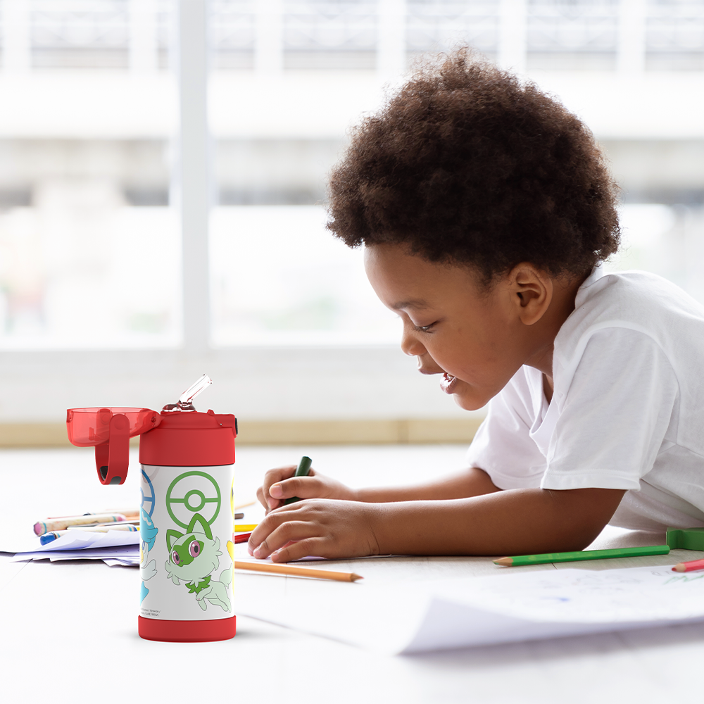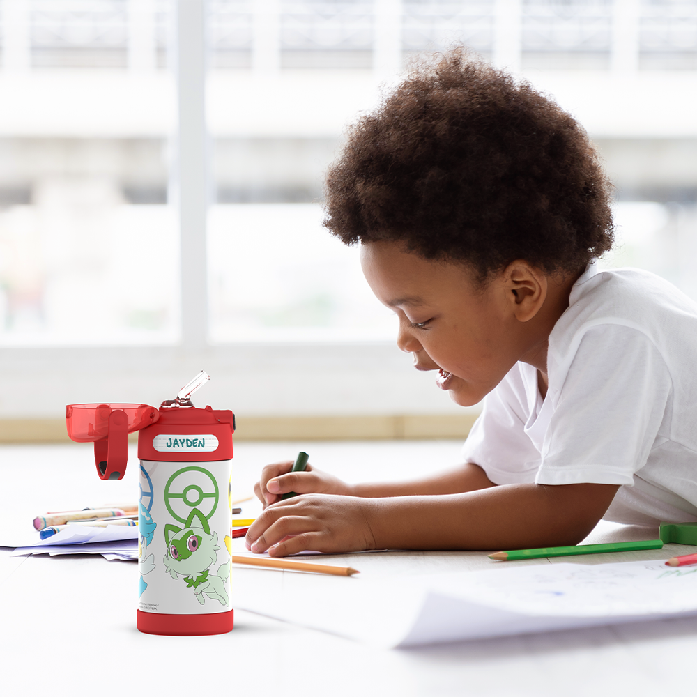 The FUNtainer? 12oz Vacuum Insulated Stainless Steel Water Bottle with Straw keeps drinks cold for up to 12 hours. The double wall stainless steel construction is built to handle drops. dings and assorted roughhousing. Includes an integrated carry handle with soft-touch grip. making it easy for kids to carry with them throughout the day. Help keep germs away with the hygienically covered silicone straw which is removable for easy cleaning. To clean. you can pop your FUNtainer water bottle in the dishwasher; however hand washing is recommended. Not for use with hot liquids. Label your FUNtainer bottle with adhesive name stickers that can be firmly adhered to any FUNtainer product. Two peel and stick labels are included inside this FUNtainer product. Fun for the kids. and easy for the parents. Just write. peel and stick!