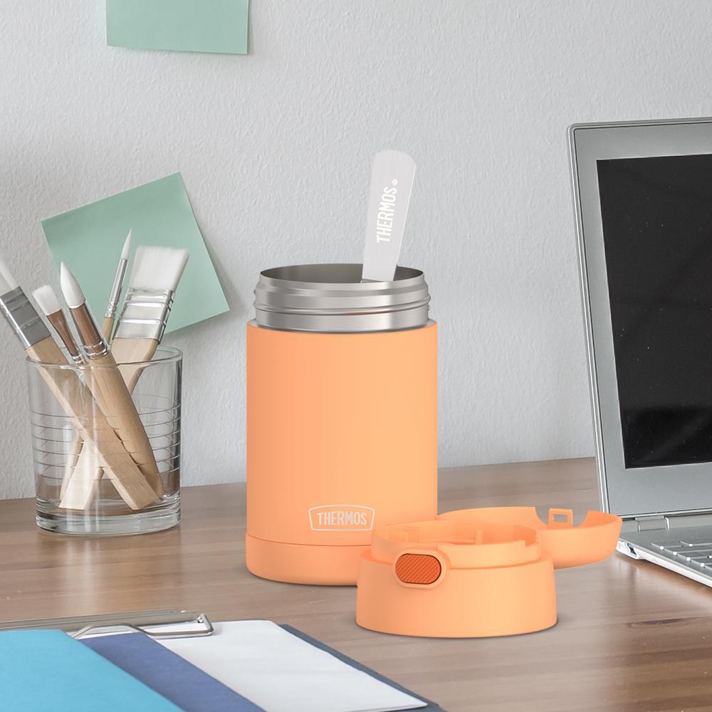 The 16oz FUNtainer? Food Jar from Thermos? brand is vacuum insulated to keep hot foods hot and cold foods cold. Plus. since it’s designed for kids. it’s also colorful and fun. Send them to school with delicious soup so they can enjoy it fresh and hot at lunch time. If they’re in the mood for a cold snack. pack it up with yogurt and berries. or apples and peanut butter. The FUNtainer? food jar is lightweight and compact with a push button lid so it’s easy to carry and open. Kids work hard and once lunchtime hits. they need the healthy stuff to power them through the rest of the day. This handy kids food container has a wide mouth. which lets them gobble and gulp their food right out of the bright-colored jar. To clean. you can pop your FUNtainer food jar in the dishwasher; however washing by hand is recommended. Customize your FUNtainer food jar with adhesive name labels that can be firmly adhered to any FUNtainer product. Two peel and stick labels are included inside this FUNtainer product. Fun for the kids. and easy for the parents. Just write. peel and stick!